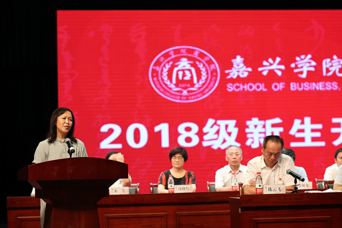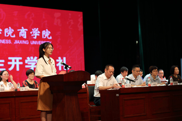 教师代表,优秀班主任、工商系教授唐雯老师对全体新同学的到来表示欢迎,她殷切的希望每一位新同学都能成为一个目标、有责任感的人,一个善于学习的有智慧的人,一个有独立人格的高尚的人,一个懂得感恩的人。在校生代表、员工会主席会计专业金嘉琪同学,2018级新生代表、市场营销专业新生唐钦芸同学分别发言。