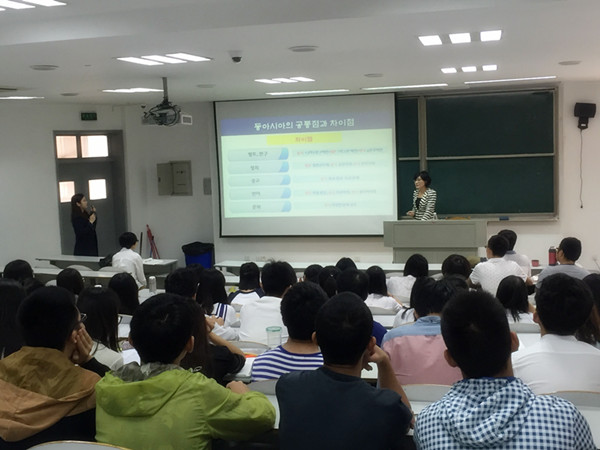 姜允玉教授现任韩国明知大学东亚研究所所长,近年来致力于从跨学科视角探讨东亚区域一体化问题。讲座中,姜教授从汉字的发展演变以及中、日、韩三国使用汉字的历史与现状等多方面为师生阐述了汉字文化传播在东亚共同体构建和东亚文化交流中的重要作用,并在讲座后与现场师生进行了热烈的互动。