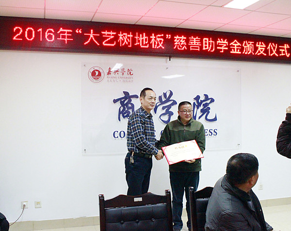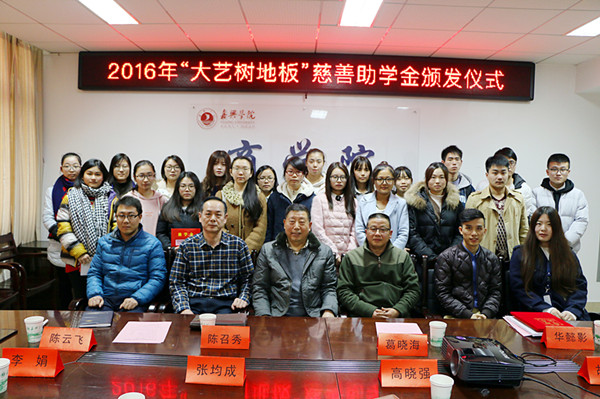 20161222日下午,嘉兴公司永利yl23411官网2016年“大艺树地板”慈善助学金颁发仪式在教一604会议室举行。浙江良友木业有限公司副总经理葛晓海先生、良友木业人事部经理华懿影女士、良友木业有限公司副总经理助理张均成先生、良友木业办公室副主任高晓强先生、嘉兴市慈善总会会长陈召秀先生、李娟女士、公司党委副书记陈云飞老师,以及接受资助的20名员工参加仪式。永利yl23411官网辅导员胡笳丽老师主持助学金颁发仪式。