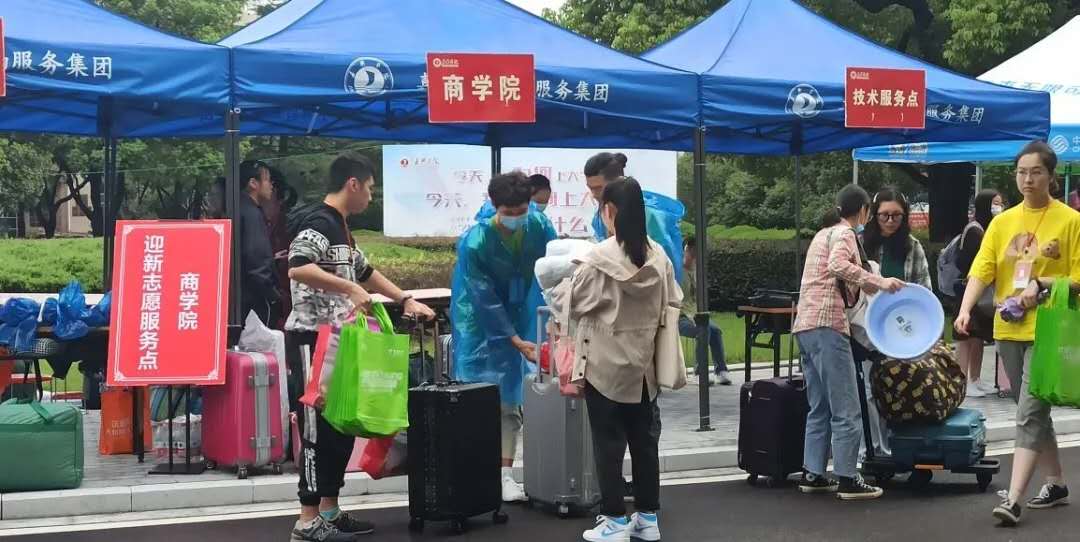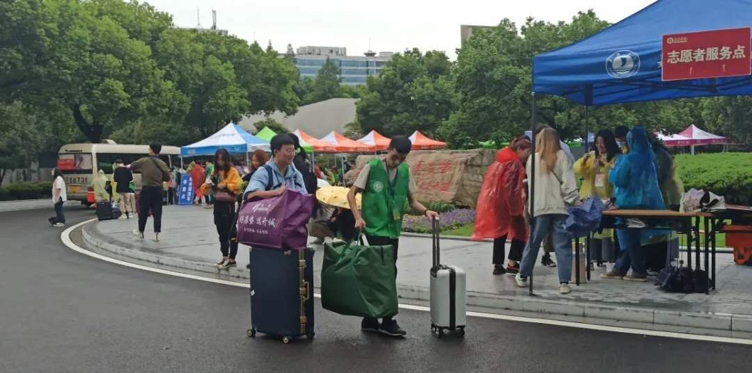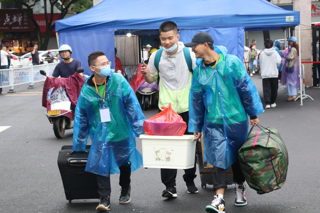 当天的报到现场,越秀南区东门、美食城广场、越秀北区南门各服务点上的新生接待工作井然有序,扫码指导、行李搬运、人流疏导、秩序维护、摆渡车调度……热情、忙碌穿梭于绵绵秋雨中的永利yl23411官网志愿者身影成为校园内靓丽的风景。
