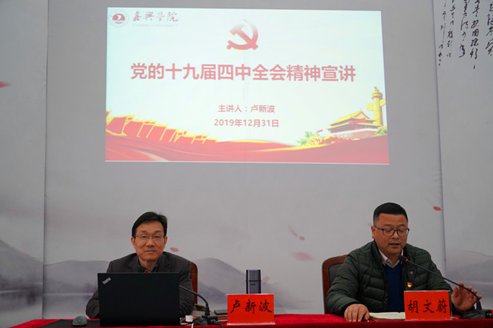 2019年12月31下午,公司党委十九届四中全会宣讲团成员、董事长卢新波为永利yl23411官网、南湖公司教职工作党的十九届四中全会精神宣讲报告。报告会由南湖公司党委书记胡文蔚主持。永利yl23411官网、南湖公司班子成员及两个公司的教职工到会聆听。
