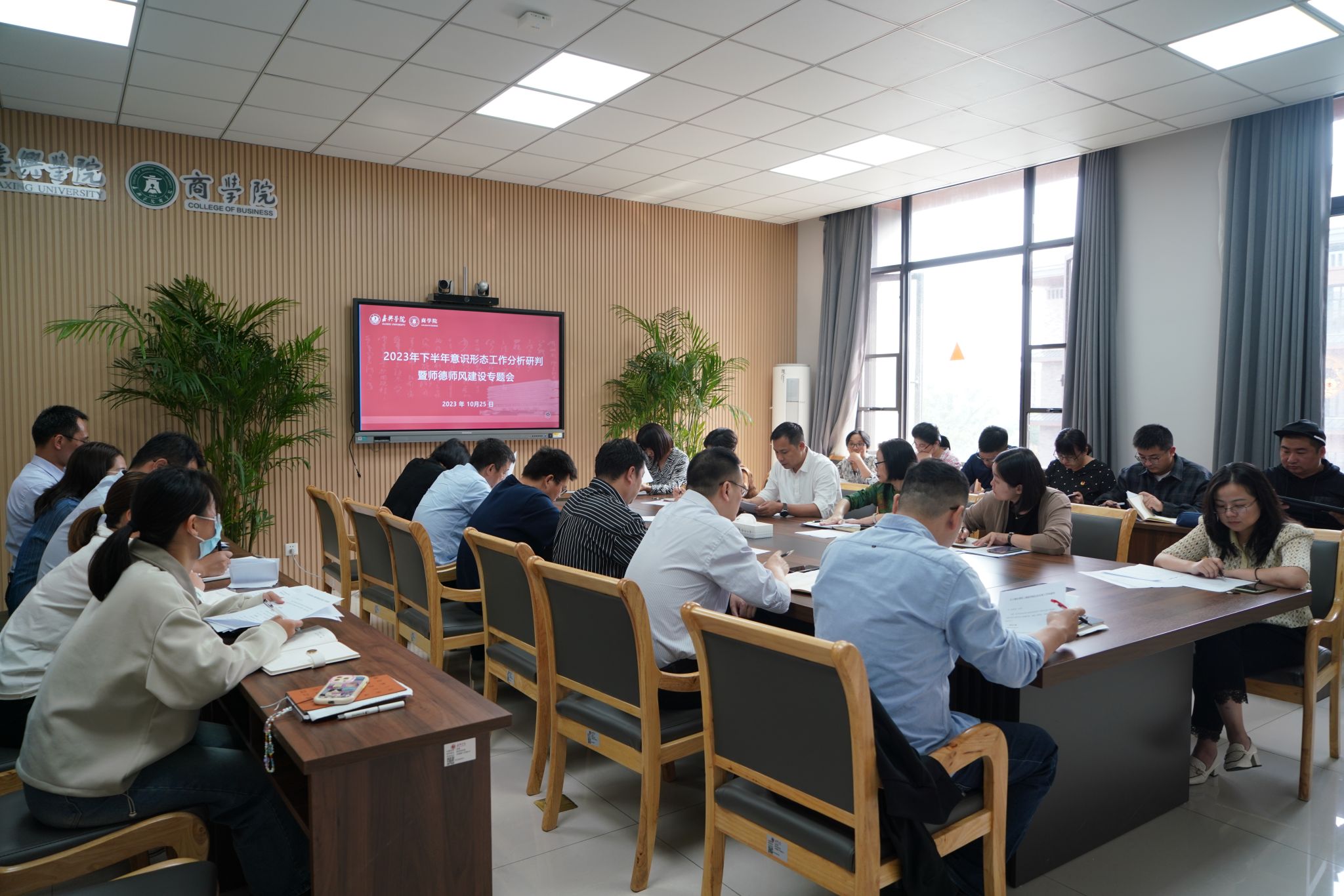 1025日下午,公司党委在尚德楼345会议室召开2023年度下半年意识形态工作分析研判暨师德师风建设专题会议。会议由公司党委书记邵燕主持。公司党委班子成员、三办主任、系主任、党支部书记和全体辅导员参加会议。