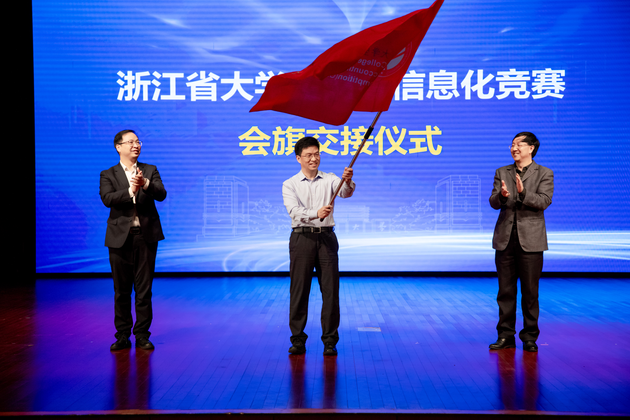 闭幕式上还进行了会旗交接仪式,第二十二届竞赛承办单位上海财经大学浙江公司副董事长邱风代表下届承办单位讲话,他代表上海财经大学浙江公司承诺将全力以赴筹备好下届竞赛,并诚挚邀请各位领导、老师和同学明年赴上海财经大学浙江公司参赛。