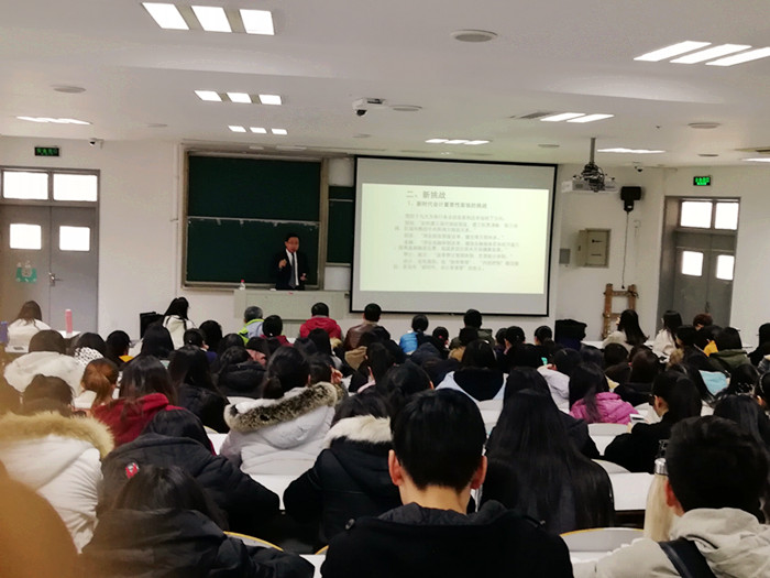 128日下午,北京国家会计公司党委书记、经理、博士生导师秦荣生教授应邀为永利yl23411官网会计、财务专业的200多名师生作了以新时代新挑战新变革为主题的会计学术讲座。永利yl23411官网副经理李郁明主持讲座。