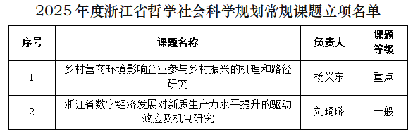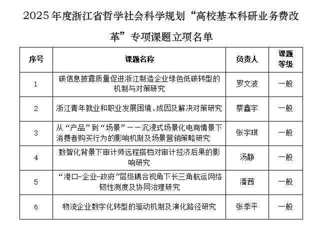 2024年920日,浙江省哲学社会科学工作办公室发布了《关于公布2025年度浙江省哲学社会科学规划课题等立项名单的通知》。公司共有8位教师的项目立项,其中包括2项常规课题(重点课题1项),以及6“高校基本科研业务费改革”专项课题,整体立项率达到了73%。