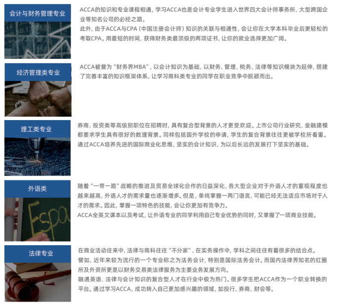 ACCA并不只是单纯地学习会计方面的知识,更是涵盖管理学、会计、法律、商务英语等模块的专业知 识框架体系,帮助你构建系统的商业思维能力。各专业的同学,通过对 ACCA 的学习并且结合自身的 专业优势,成为一名国际化的复合型人才。