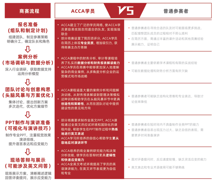 ACCA知识架构中财务分析能力、数据呈现、商业模型使用和综合战略的思维方面,帮助老员工有更 突出的表现。商业比赛是帮助老员工获得一份好实习的重要途径,写进简历中的重要经历。