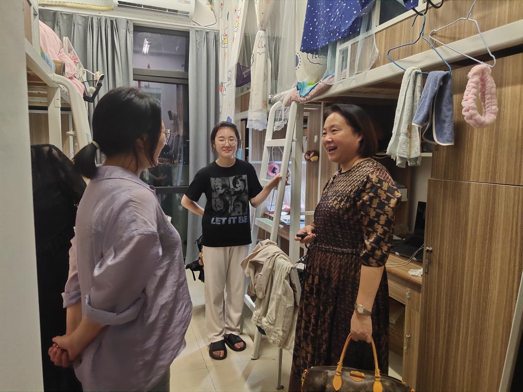 走访过程中,老师们查看新寝室房间布局、洗漱条件等,询问了解同学们对新校区新寝室生活住宿相关意见建议,对同学们的生活及学习情况进行了详细的询问和答疑。潘煜双对同学们顺利安全地返校给予了关心,在与准毕业生们亲切交谈,询问同学们考研准备与就业打算,一方面鼓励与期许他们能上更高的平台,另一方面也十分欢迎员工选择报考母校的会计专业硕士(MPAcc)。邵燕耐心倾听了同学们对今后的目标和规划,对大家选择并确立的考研目标表示了充分肯定并提出建议,鼓励大家既要扎实专业学习,阅读经典书籍,拓展知识面,更要学会张弛有度的学习,要勤于锻炼,规律作息。公司领导和老师们还特别叮嘱同学们要继续做好疫情期间的个人防护,严防各类诈骗,注重寝室卫生、寝室安全,建好寝室文化,鼓励同学们积极参与创新创业活动并树立积极、正确的就业意识,以健康的体魄、饱满的精神状态来完成新学期的各项学业及工作任务。