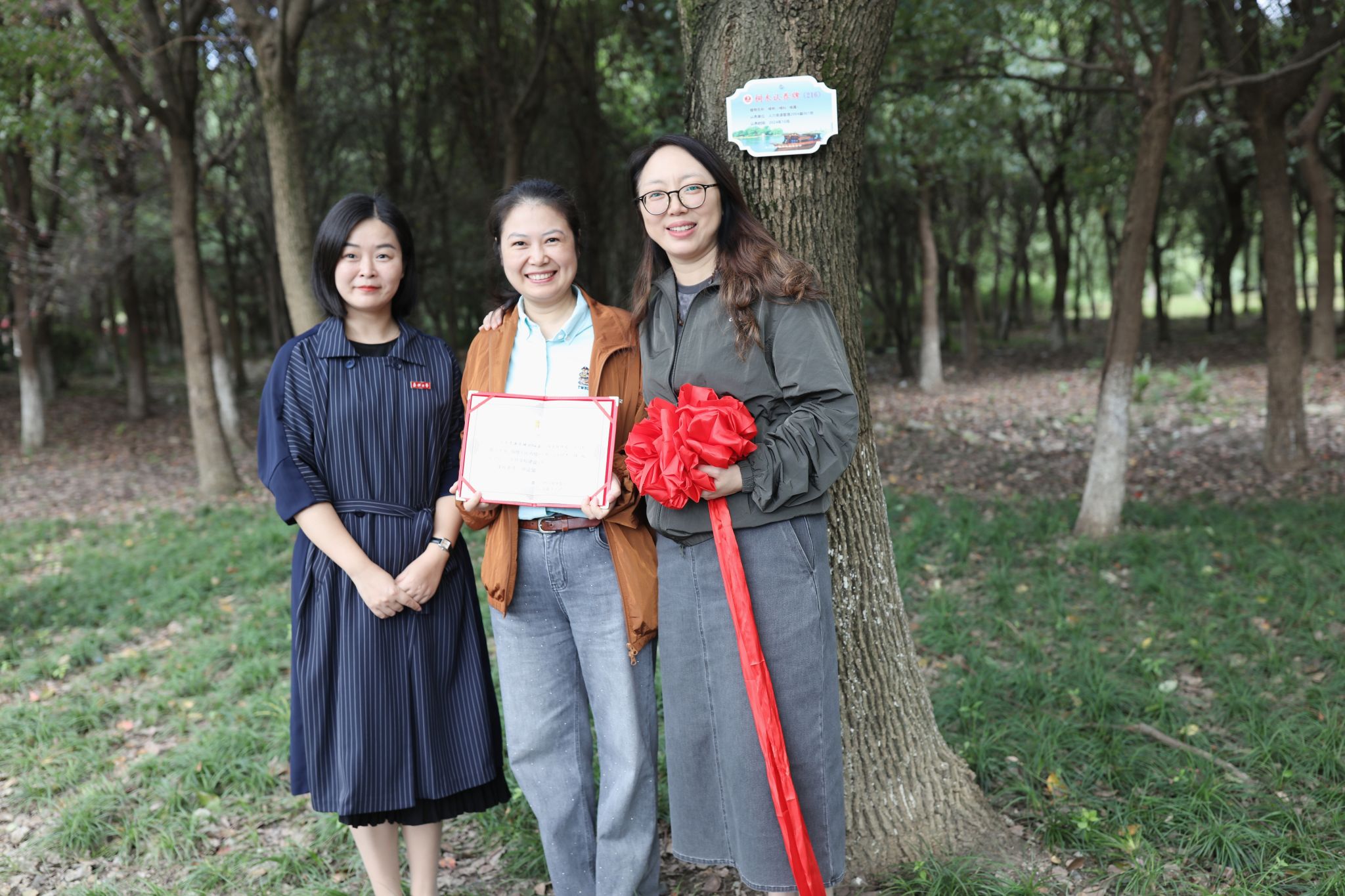仪式上,潘欣代表公司与员工代表们一起为员工树揭牌并分别为员工代表颁发捐赠证书。
