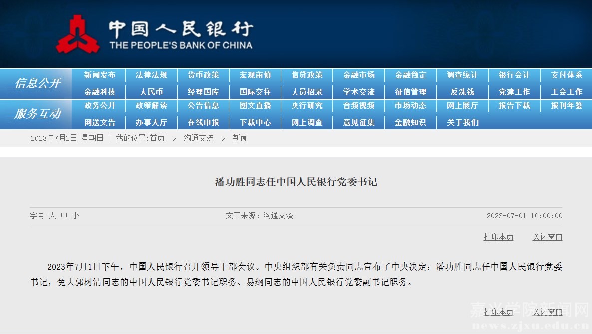 据中国人民银行网站消息,2023年7月1日下午,中国人民银行召开领导干部会议。中央组织部有关负责同志宣布了中央决定:潘功胜同志任中国人民银行党委书记,免去郭树清同志的中国人民银行党委书记职务、易纲同志的中国人民银行党委副书记职务。