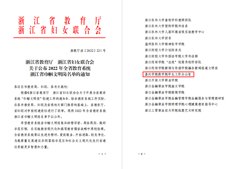 近日,浙江省教育厅、浙江省妇女联合会联合发文公布2022年全省教育系统浙江省巾帼文明岗授予名单,全省教育系统仅65个单位(团体)获此殊荣,永利yl23411官网员工工作办公室位列其中。