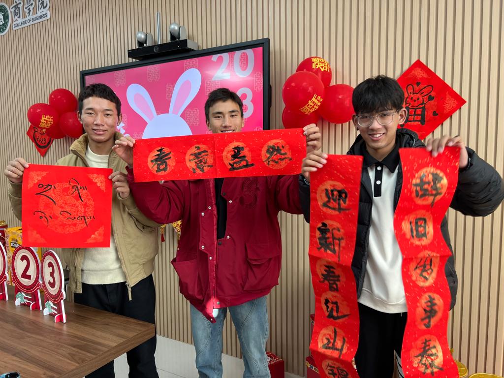 座谈会上,还通过视频连线的方式与营销202班旦增云丹远在西藏拉萨的母亲进行了家校联系。与会同学畅所欲言,对公司的悉心安排与迎春惊喜表示感谢,并围绕假期实习、学习、生活展开交流。来自西藏日喀则的物流22级员工格桑罗布表示,公司让他感受到家的温暖,今年将是一生中难忘的一个春节。这也是他没能和父母在一起度过的第一个春节。会后,与会老师与同学们一起写春联,送春节大礼包和防疫物资,整个活动现场洋溢着欢快、祥和的节日氛围。